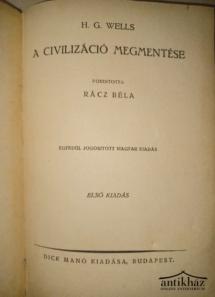 H. G. Wells A civilizáció megmentése (eredeti cím: The Salvaging of Civilization) egy 1921-es esszékötet, amelyben a szerző a háború utáni világ válságára keres megoldást. Wells a nemzetállamok versengése helyett egy központosított, globális irányítást javasol.egy világállam (világállam) létrehozását, az oktatás reformját és egy egységes, tudományos alapú civilizáció kialakítását sürgeti a társadalmi összeomlás elkerülése érdekében.