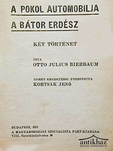 A történet az automobilizmus hőskorában született, amikor az autó még félelmetes és titokzatos újdonságnak számított. Bierbaum maga is úttörő autós volt: 1902-ben az elsők között utazott át Németországból Olaszországba egy Adler típusú kocsival. A mű egyfajta társadalmi szatíra vagy fantasztikus elbeszélés, amely az autó pusztító erejét és a technikai haladás „ördögi” természetét járja körül. Otto Julius Bierbaum (1865 - 1910) akit Martin Möbius és Simplicissimus álnéven is ismertek, német újságíró, szerkesztő, író és szövegíró volt. A kortárs írókra és a későbbi generációkra gyakorolt hatása tagadhatatlan. Bierbaum olyan szerzőket inspirált, mint Thomas Mann és Hermann Hesse, akik csodálták a mindennapi és a fantasztikus ötvözésének képességét (pl. Sonderbare Geschichten - Furcsa történetek, 1908). Papírkötéssel átkötött, eredeti borító már nincs meg, jó állapotban.