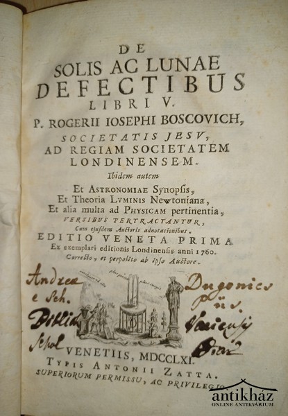 Ibidem autem et astronomiae synopsis, et theoria luminis Newtoniana, et alia multa ad physicam pertinentia, versibus pertractantur, cum ejusdem auctoris adnotationibus. ('A Nap és a Hold hibáiról, 5. könyv. Ugyanitt a csillagászat, a newtoni fényelmélet és sok más, a fizikához kapcsolódó dolog összefoglalása is versben kerül tárgyalásra, ugyanazon szerző jegyzeteivel'.) Boscovich tudományos műve a nap- és holdfogyatkozásokról, valamint newtoni fizikai elméletekről szóló, latin nyelvű, verses formában írt munka, amely kiterjedt magyarázatokat (adnotationibus) is tartalmaz. Az 5 könyv a fogyatkozások elméletével, Newton fényelméletével, valamint fizikai kérdésekkel foglalkozik. Didaktikus költemény (versbe szedett tudomány), melyet a szerző saját megjegyzéseivel látott el. A Petrik Géza-féle Magyar Könyvészet megemlíti a művet a magyarországi vonatkozású (vagy itt ismert) 18. századi tudományos munkák között. Latin nyelvű, átkötött, jó állapotban.