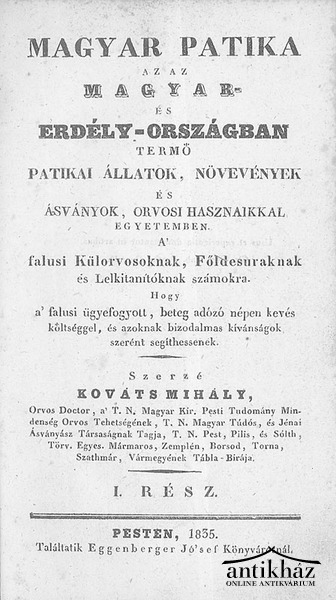 VISSZA A CSOPORTHOZMagyar patika, az az Magyar- és Erdély országban termő patikai állatok, növények és ásványok, orvosi hasznaikkal egyetemben I-III. rész (egybekötve)
