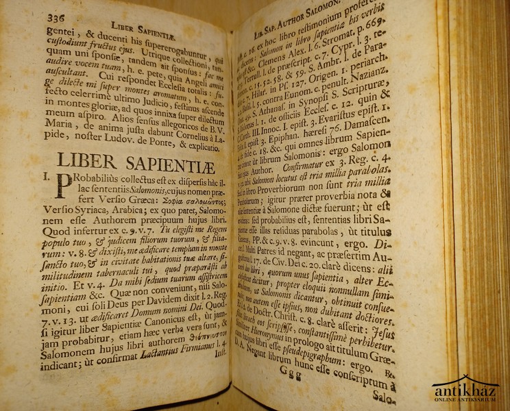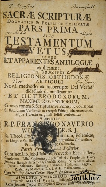 Sacrae Scripturae Dogmatice Ac Polemice Explicatae, Pars Prima Sive Testamentum Vetus, In Quo Et Apparentes Antilogiae explicantur; Et Praecipue Religionis Orthodoxae Articuli Nova methodo ex incorrupto Dei Verbo didactice demonstrantur; Et Heterodoxorum, Maxime Recentiorum, Graves contra S. Scripturam errors, ac corruptae Ss. Bibliorum Versiones ex receptis Principiis hermeneuticis, atque e Textu originali solid confutantur... : Partis Primae Tomus Posterior Continet Lib. Jób, Psalmos, Proverbia, Ecclesiasten, ... Prophetias Isaiae, Jeremiae ... Lib. I. & II. Machabaeorum A „Sacrae Scripturae pars prima sive Testamentum Vetus” a Szentírás első részét, azaz az Ószövetséget jelöli, amely a keresztény Biblia alapját képezi. Gyakran dogmatikai és polemikus (hitvitázó) magyarázatok gyűjteménye, amely az ortodox vallási cikkelyeket mutatja be az eredeti szövegek alapján. Az Ószövetség könyveit (Genezis, Exodus, Leviticus, Numeri, Deuteronomium, stb.) tartalmazza. Célja a látszólagos ellentmondások (antilogiae) feloldása és a dogmák bizonyítása. Latin nyelvű. Korához képest jó állapotban.