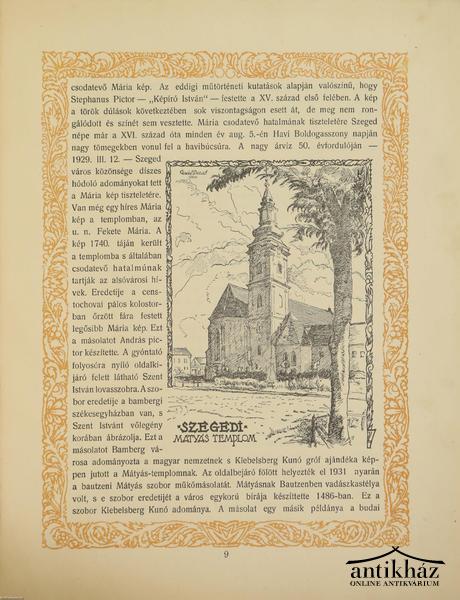Tunyogi Csapó János Reálgimnáziuma 1934-34. évi értesítőjének függeléke. E kis füzet Szeged templomainak képével és leírásával ajándékozza meg a szíves olvasót. A képek Gaál Dezső munkái, ceruzarajz, linometszet, krétarajz, fametszet és akvarell technikával készültek. A kötetet keretléces oldalak és szövegközti, részben kőnyomatos illusztrációk díszítik. Jó állapotban, a táblákat védő hártyapapírból néhány hiányzik.