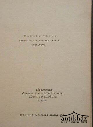 Első esetben készült Szeged megyei jogú város gazdaságának, a lakosság szociális és kulturális ellátottságának valamennyi fontosabb adatát tartalmazó statisztikai gyűjtemény. Készült 150 példányban "hivatalos használatra". Jó állapotban.